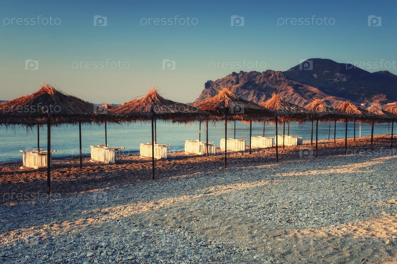 Утренний пляж с зонтиками