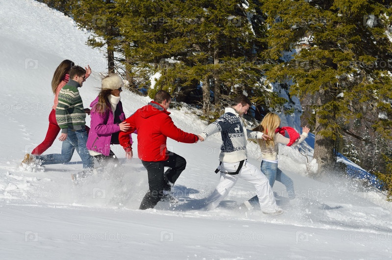 Друзья играют на свежем снегу