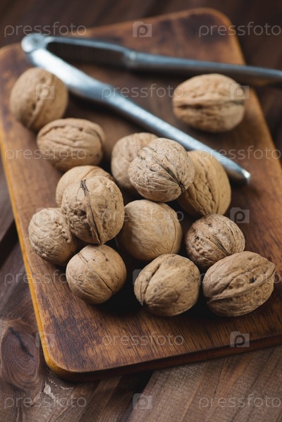 Грецкие орехи и щипцы на разделочной доске