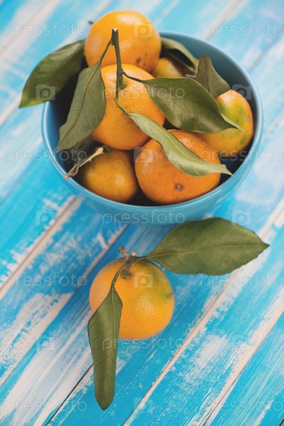 Спелые мандарины с листьями, синий деревянный фон