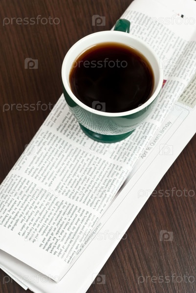Чашка кофе и газета на темном столе