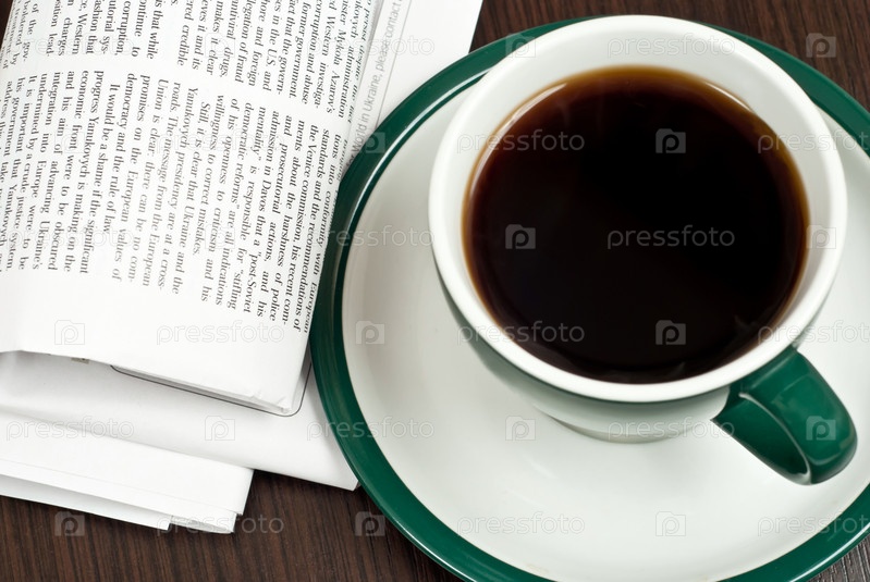 Чашка кофе и газета на темном столе