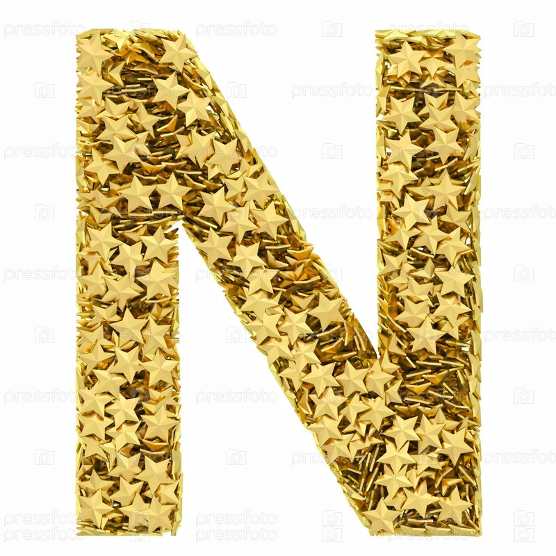 Буква N из золотых звезд, изолированная на белом. 3D-изображение высокого разрешения