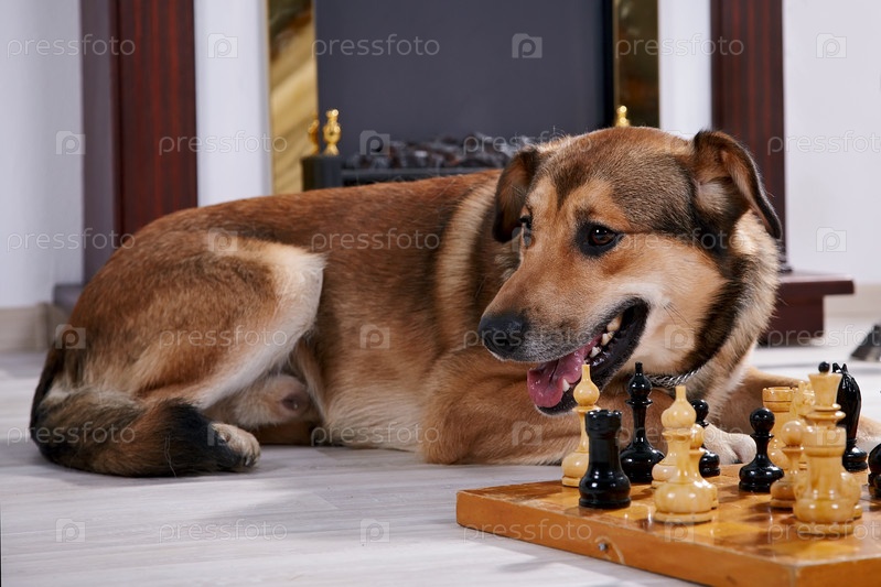 Собака с шахматной доской у камина