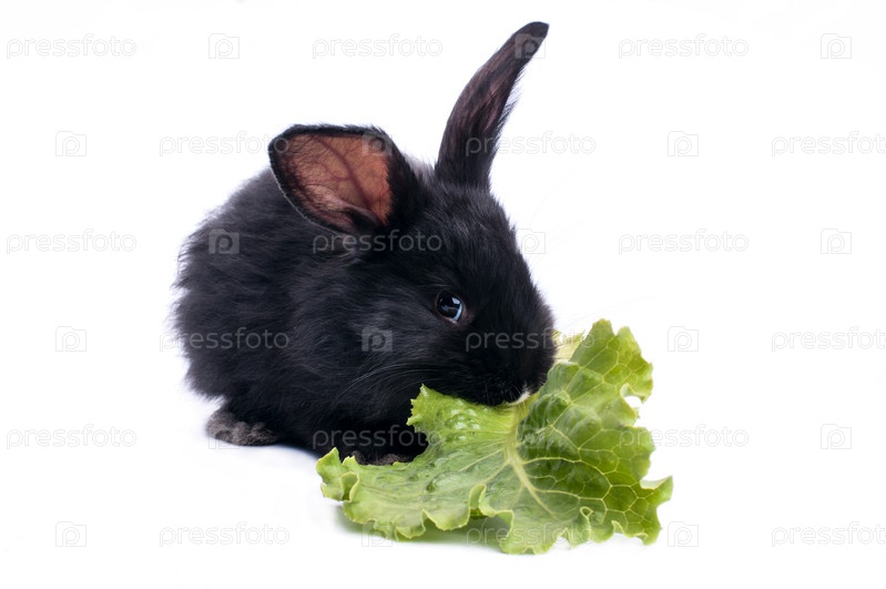 Милый черный кролик ест зеленый салат