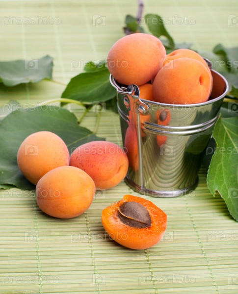 Абрикосы с зелеными листьями