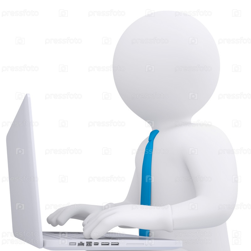 Белый 3D человек, работающий на ноутбуке