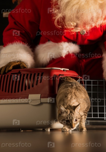 Санта-Клаус и кошка под елкой