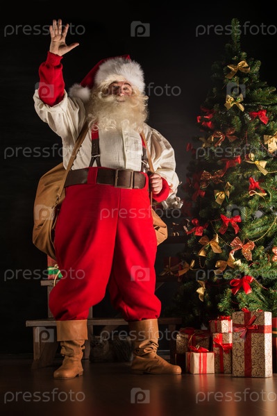 Санта-Клаус с мешком подарков дома возле елки