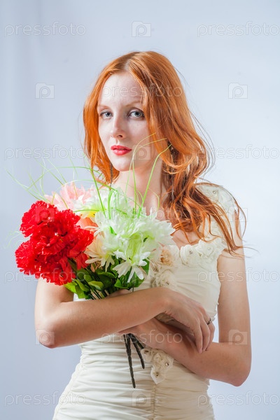Рыжая женщина в студии на белом фоне