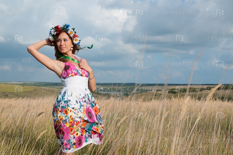 Рыжая девушка на весеннем пшеничном поле