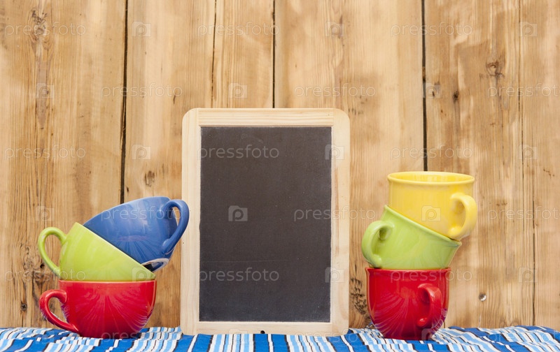 Красочные кофейные чашки и чистая дощечка на полосатой скатерти