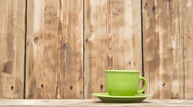 Зеленая кофейная чашка на деревянном фоне
