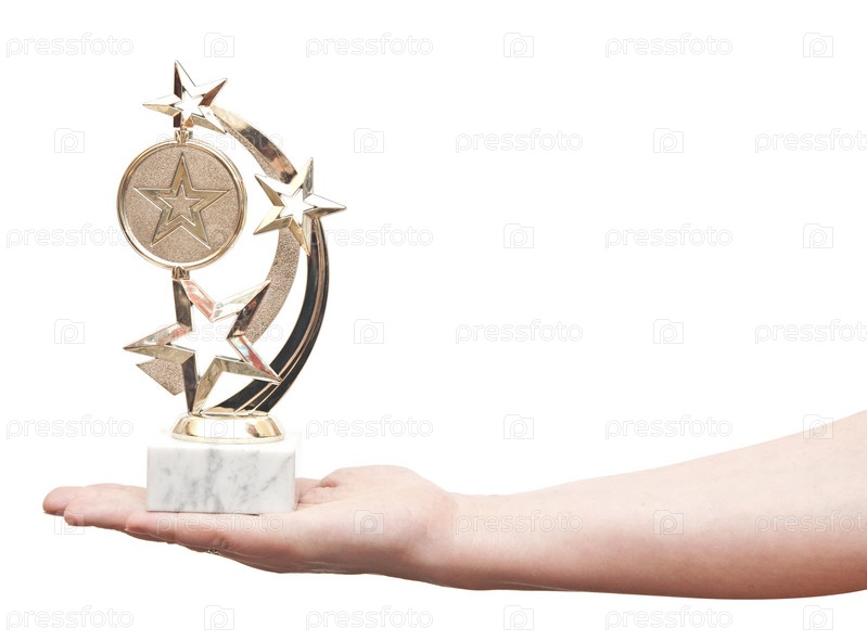 Победитель держит золотую награду со звездой