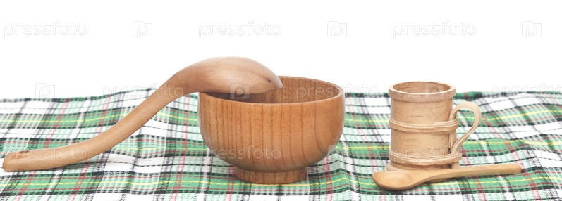 Деревянная посуда на красочной скатерти