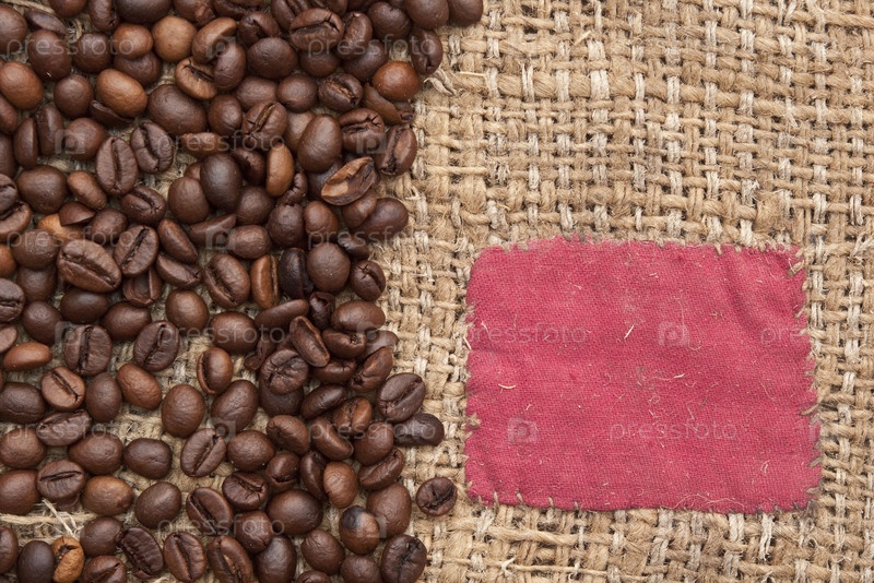 Кофейные зерна на старом холсте с красной заплатой