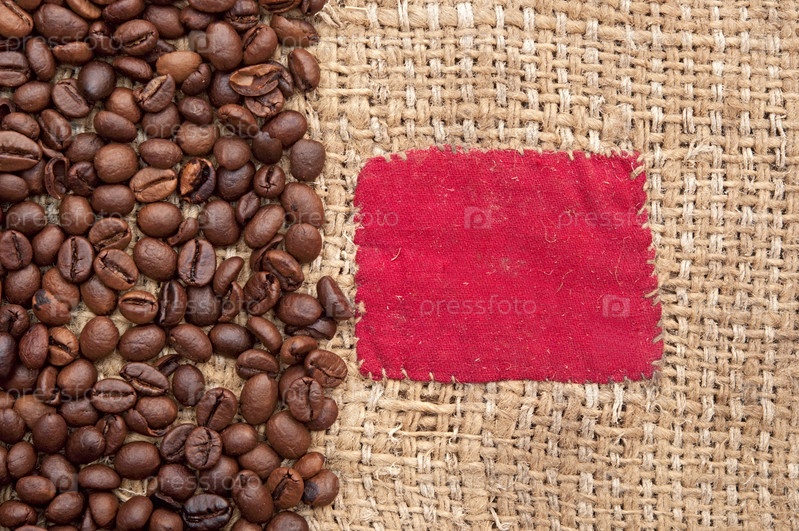 Кофейные зерна на старом холсте с красной заплатой