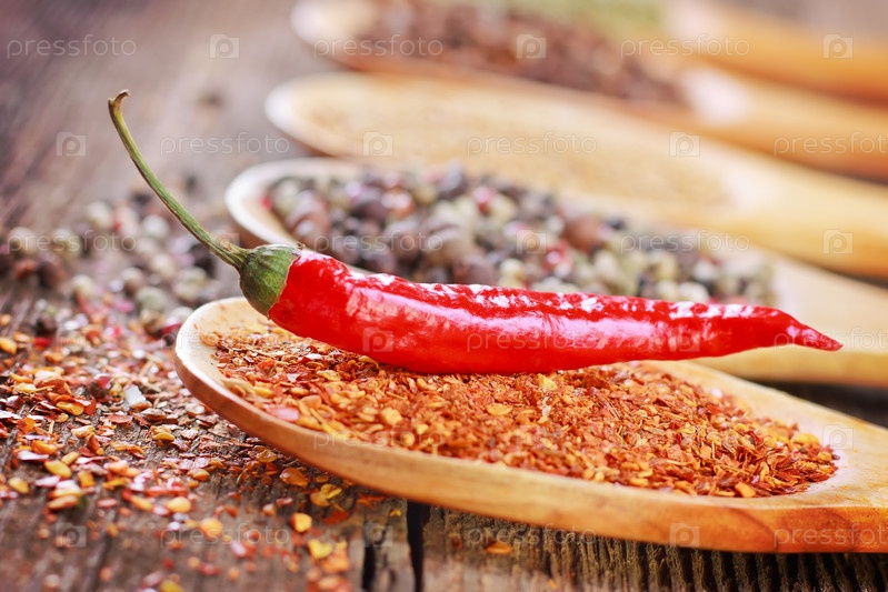 Острый перец и специи в ложках крупным планом