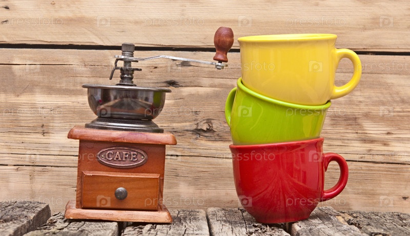 Красочные кофейные кружки с кофемолка на деревянном фоне