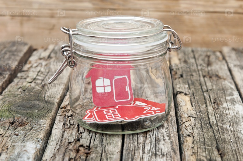 Фигурки дома в стеклянной банке на древесине