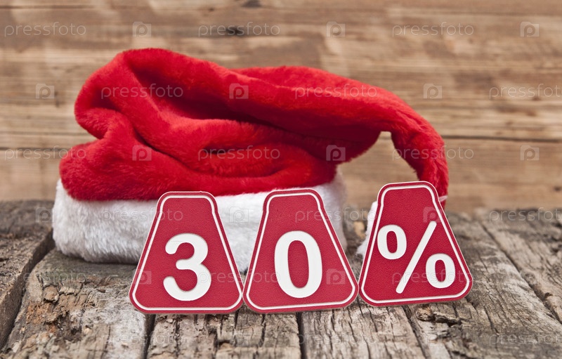 Знак 30% и колпак Санта-Клауса на старой древесине