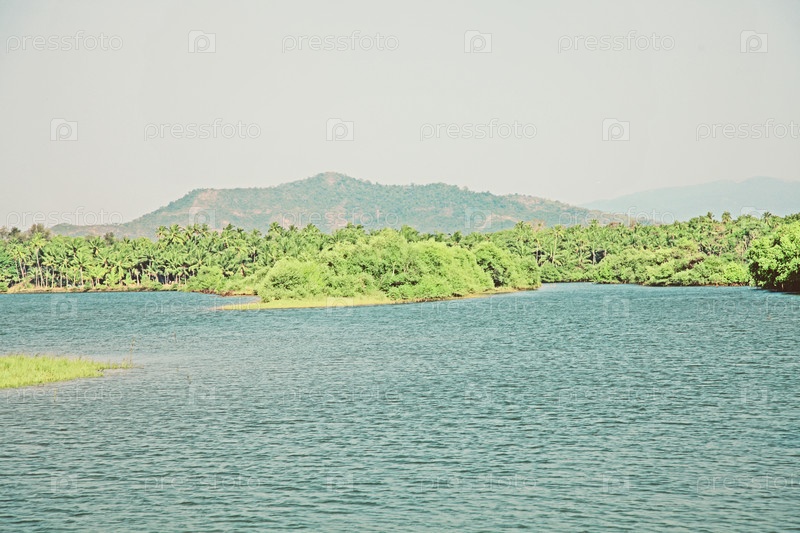 Голубое озеро в тропическом лесу на фоне гор