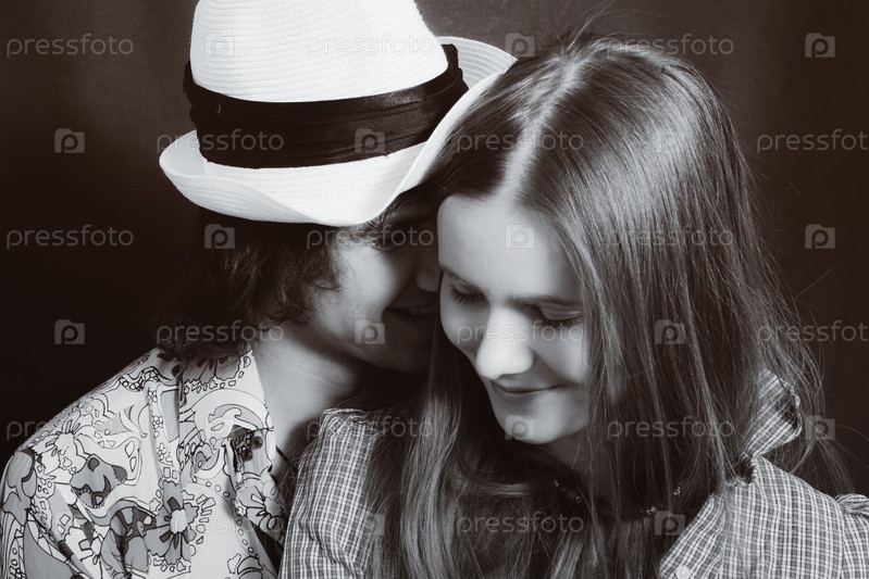 Студийный портрет молодых влюбленных мужчины и женщины на черном фоне