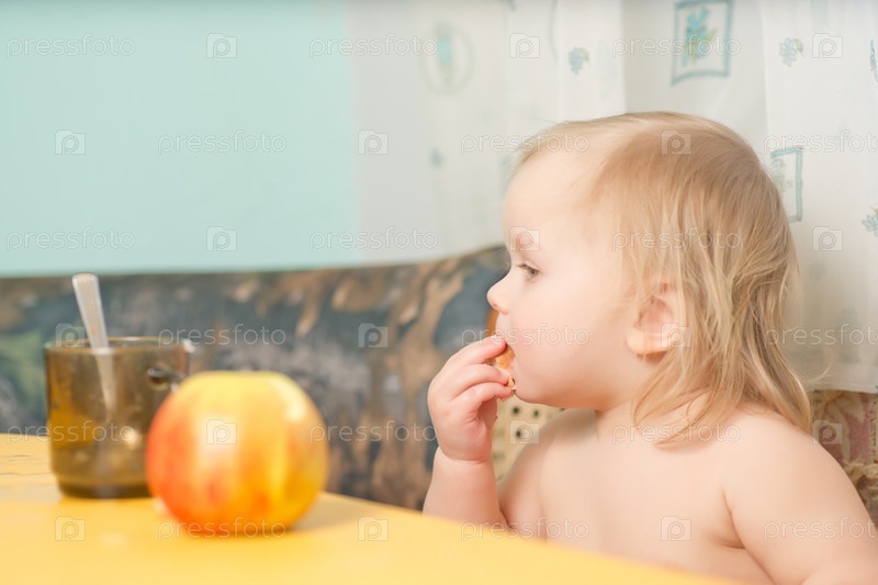 Очаровательный ребенок ест хлеб с чаем и яблоком