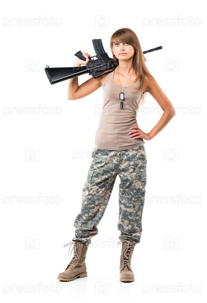 Красивая девушка в камуфляже с оружием на белом фоне