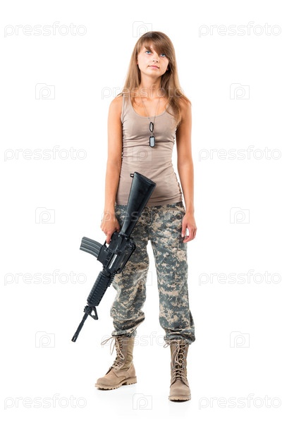 Красивая девушка в камуфляже с оружием на белом фоне