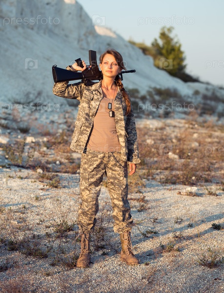 Молодая женщина в камуфляже с оружием на свежем воздухе