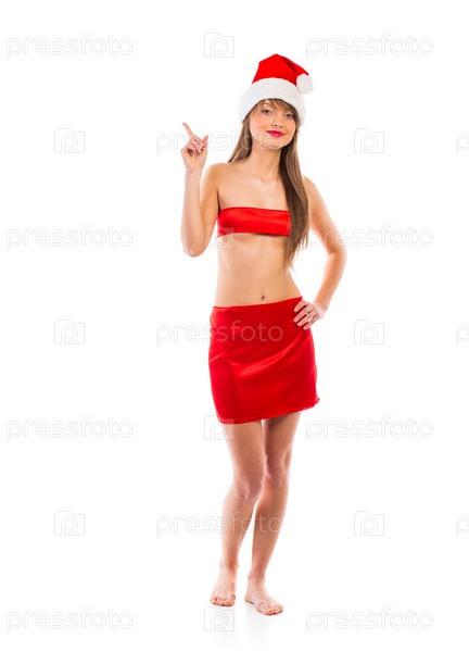 Красивая девушка в рождественской шапке показывает пальцем на белый фон