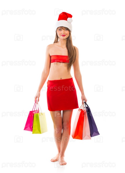 Красивая девушка в шапке Санта-Клауса с пакетами на белом фоне
