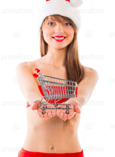 Красивая девушка в шапке Санта-Клауса с тележкой для покупок