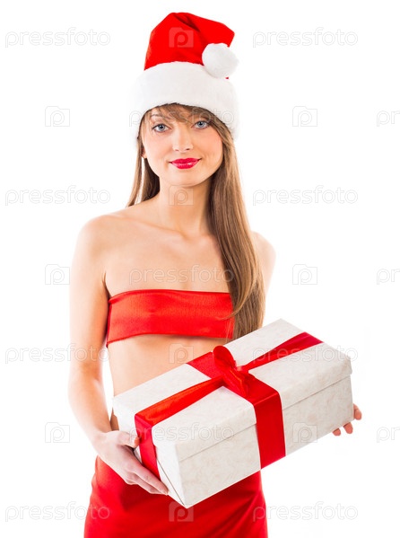 Красивая девушка в шапке Санта-Клауса с подарком, изолированная на белом