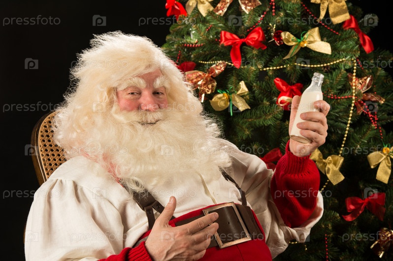 Счастливый Санта-Клаус пьет молоко из стеклянной бутылки