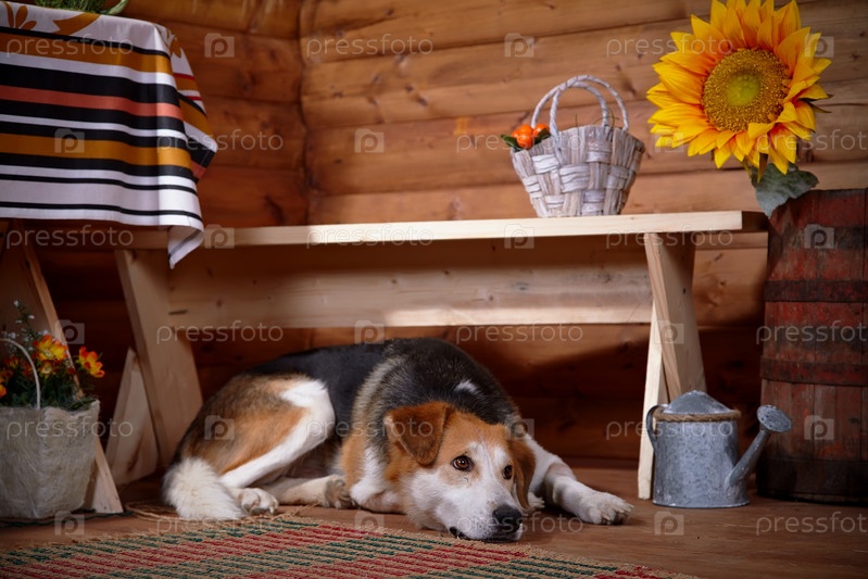 Печальная собака лежит под скамейкой в сельском доме