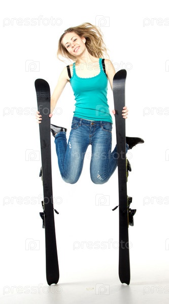 Девушка держит лыжи в студии