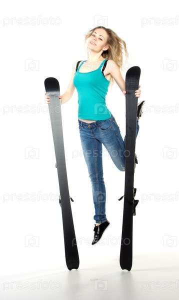 Девушка держит лыжи в студии