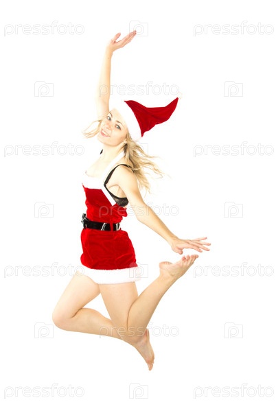 Счастливая улыбающаяся женщина в красном Рождественском костюме в высоком прыжке