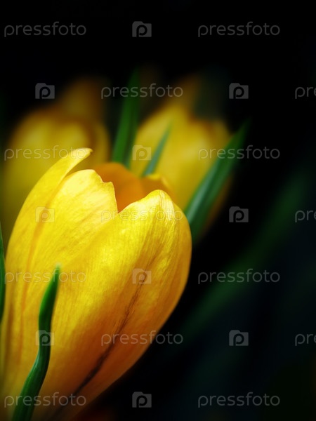 Желтые крокусы на черном фоне крупным планом