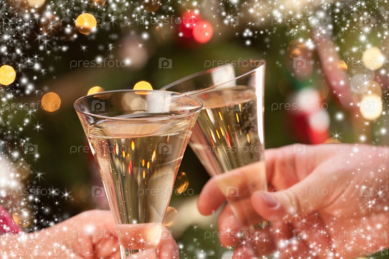 Руки с бокалами шампанского на фоне гирлянды