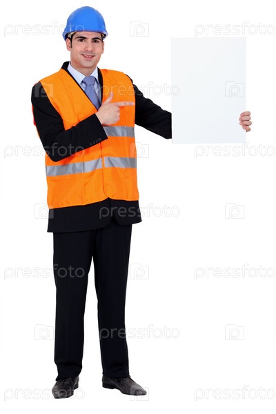 Мужчина в каске с плакатом
