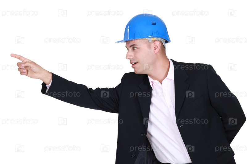 Бизнесмен в каске указывает на что-то