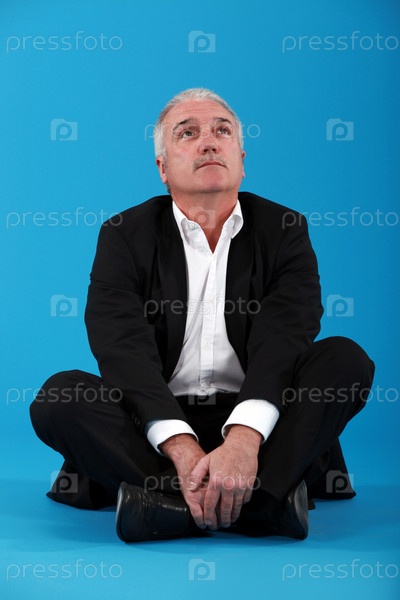 Задумчивый бизнесмен на синем фоне