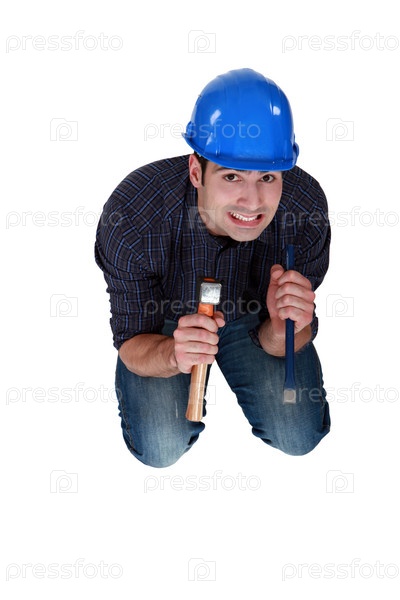 Нервный столяр держит молоток и зубило