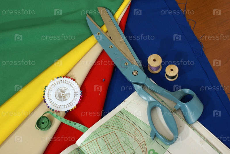 Портняжное дело. Ткань, булавки, ножницы, нитки, выкройки