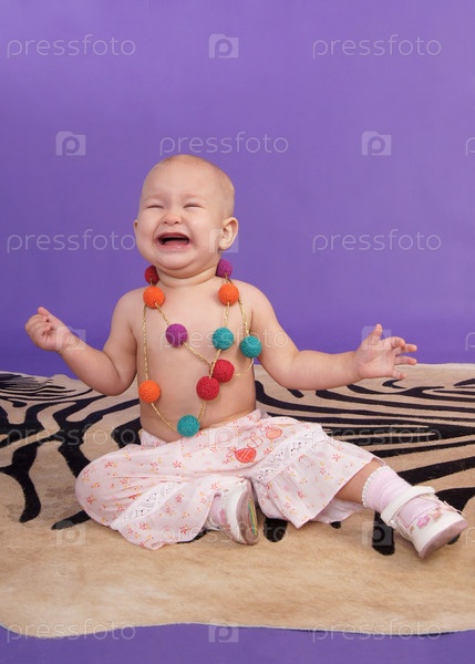 Плачущая маленькая девочка сидит на искусственной шкуре зебры