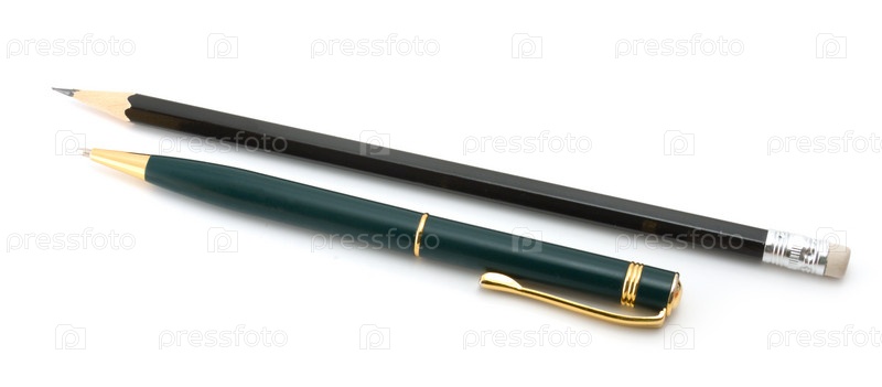 Офисные принадлежности - ручка и черный карандаш на белом фоне