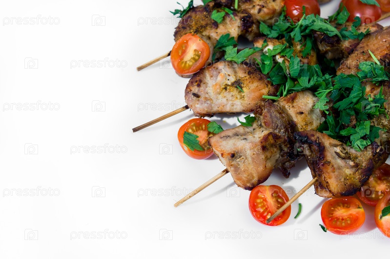 Шашлык на шампурах, украшенный черри